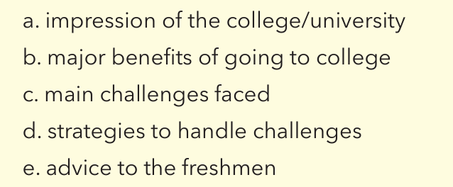 Situation: It’s always a good idea for freshmen to learn from fellow students. Work in groups to find out the benefits they have gained at college and the challenges they have faced.